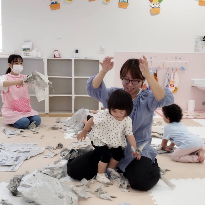 その後 新聞紙ビリビリ遊びとボールプールに別れて遊び、