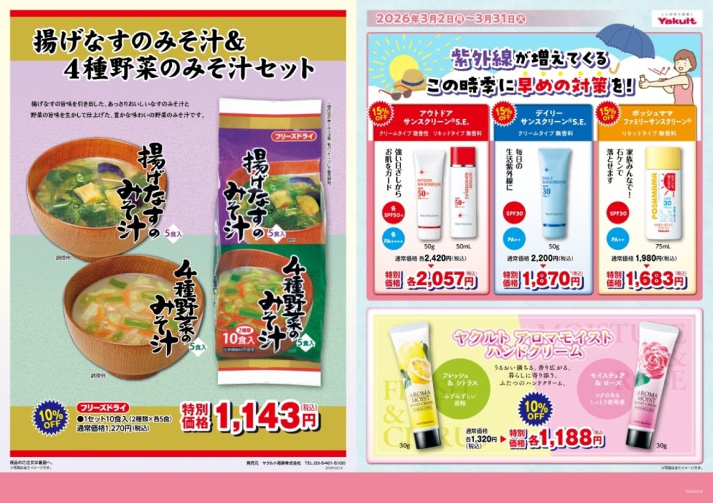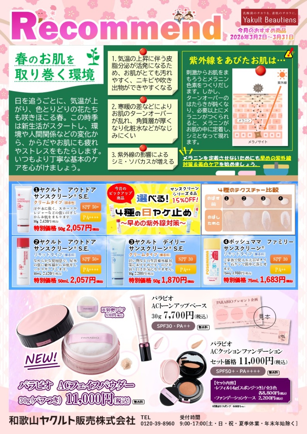 3月のセール商品 2026.03.02 暖かくなってきましたね!😊 暖かくなるのは嬉しいけど、花粉が辛い…💦 そんなときはヤクルトの「はっ酵果実」です! あなたの鼻の不快感を解消します✨ 早めの紫外線対策も万全に! 3月のセール商品です🌱 Tweet Share Hatena Pocket RSS feedly Pin it この記事のタイトルとURLをコピーする 2月のセール商品 前の記事